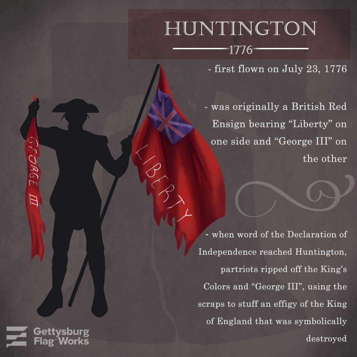 Historic Huntington Red Liberty Flag of 1776, recreated for outdoor display.