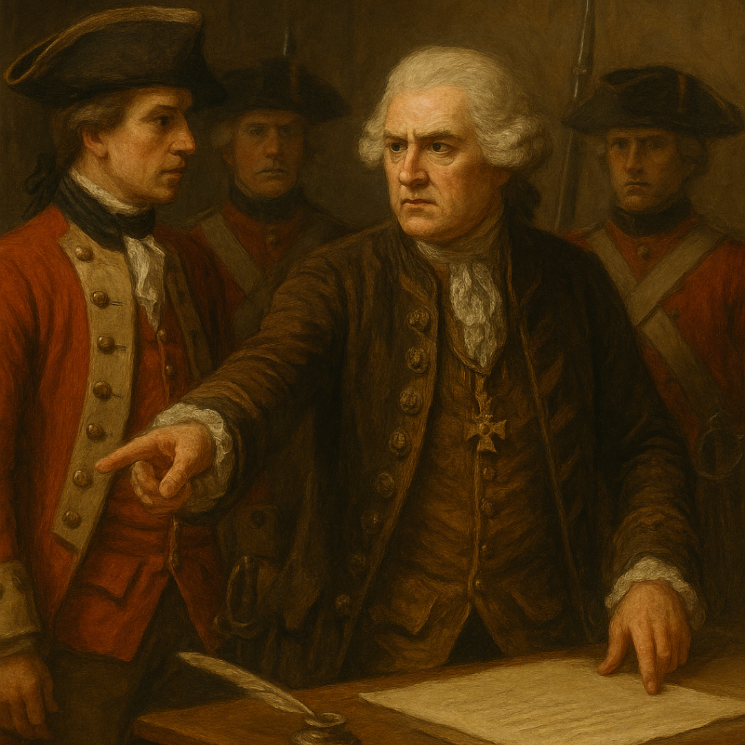 General Gage offers a general pardon to rebels who surrender—excluding Samuel Adams and John Hancock—officially criminalizing resistance.