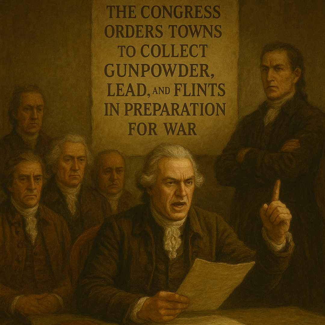 The Congress orders towns to collect gunpowder, lead, and flints in preparation for war.