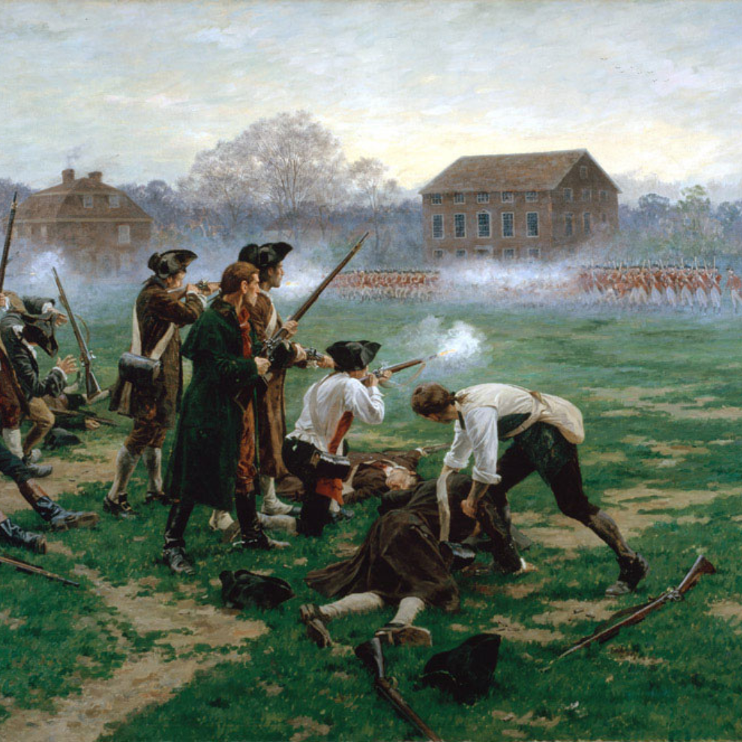 Colonial militia confront British troops, marking the outbreak of the Revolutionary War with “the shot heard 'round the world.”