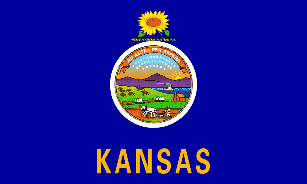 The crest is a sunflower, while the state seal, which had been approved in 1861, consists of many elements, much of it reflective of Kansas’ agriculture. The flag also carries a motto: “Ad astra per aspera.” It means “through hardships to the stars.” In 1961, its centennial of statehood, the word “Kansas” was added to the design for good measure.