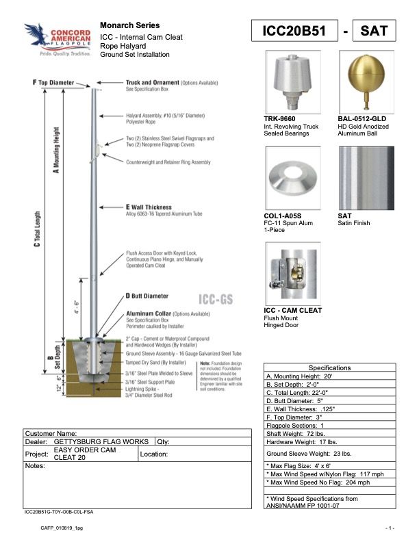 Any damage MUST be noted at the time of delivery and immediately reported to Gettysburg Flag. Once a pole is accepted, Gettysburg Flag is not responsible for addressing any damage.