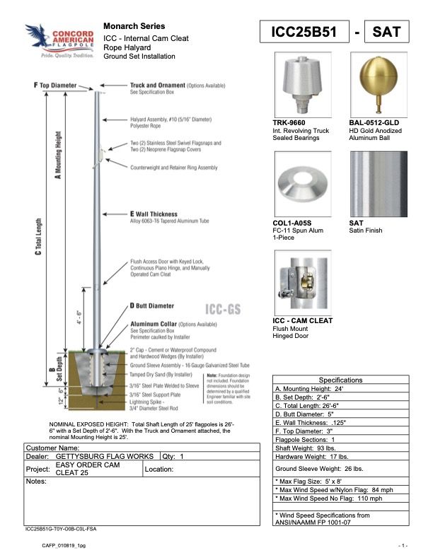 Any damage MUST be noted at the time of delivery and immediately reported to Gettysburg Flag. Once a pole is accepted, Gettysburg Flag is not responsible for addressing any damage.