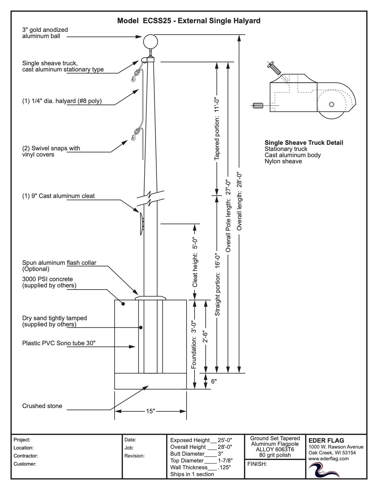 25' satin aluminum flagpole. Single-piece construction with an external halyard and gold ball.