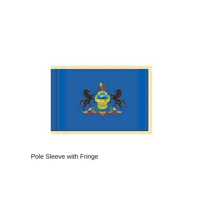 Indoor Pennsylvania state flags are available in several popular sizes with gold fringe and a pole sleeve for mounting. This style flag is also used for parade use although the fringe should not get wet in the rain. Please call us if you don't see the size or style Pennsylvania flag that you are looking for. We can find, or custom make the perfect flag for your display.