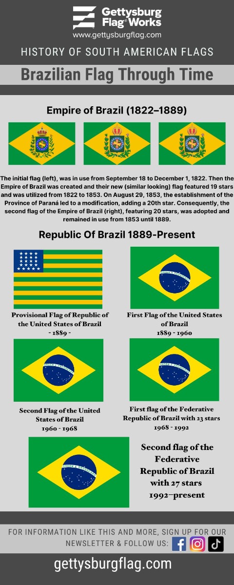 Over time Brazil has been colonized by the Portuguese and had adopted the flag of the United Kingdom of Portugal, Brazil and the Algarves. Then, in 1822 the first Independent Kingdom of Brazil was established and three flags were used throughout that 50 year time period. Each of these flags were very similar to the last. The most current era of Brazil is the Republic of Brazil which still stands tall today. There have been 5 flag variations in this time starting with the provisional flag of the Republic of the United States of Brazil, going all the way to the current Brazilian flag.