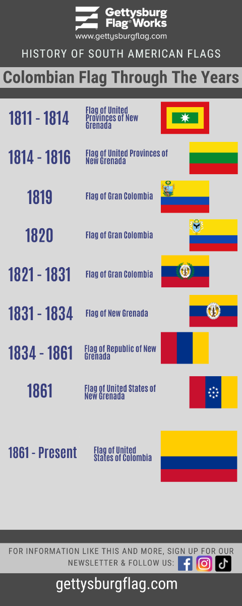 Eventually, the current flag of the United States of Colombia was created and enacted in 1861 and stands today under the current republic of Colombia. It is a rather unique flag due to the fact that one color (yellow) owns half of the flag while the other two stripes make up a quarter each.
