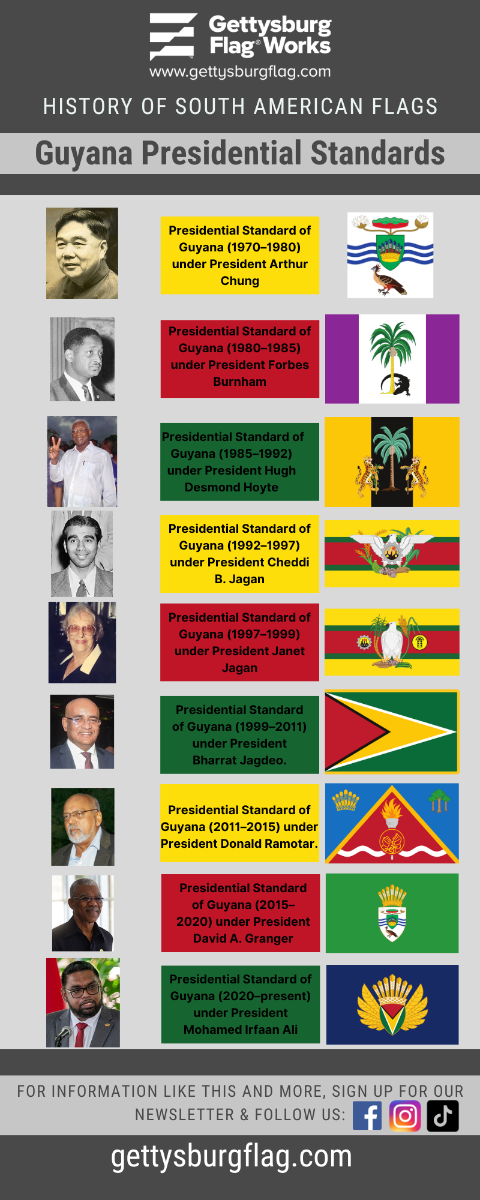 Each President that has been elected in Guyana has been able to proclaim a presidential standard flag to represent their presidency. This is a symbolic gesture and doesn't happen in every country, but in Guyana there have been 10 presidents that have created standards for the country. They range in design dramatically and are very interesting to break down. Check out the infographic to the right for all the Ecuadorian Presidential Standards (as of 2023)
