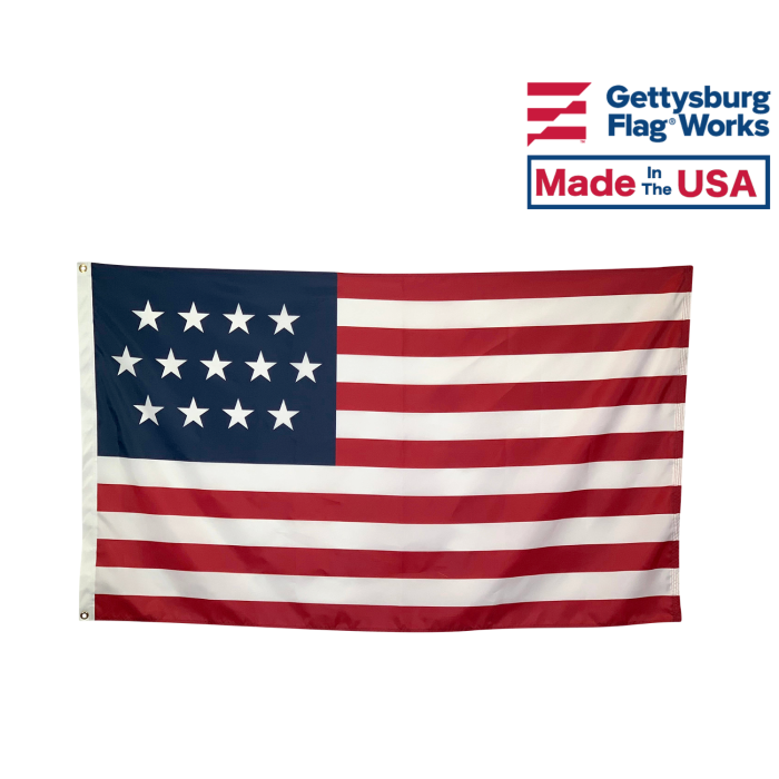 Revolutionary War Era American flag, also known as the Fort Independence flag. This historic flag was flown during the war at Fort independence in the Boston Harbor. The Fort also served as an armory during the Civil War, with the Fourth Battalion of Massachusetts Infantry stationed there!