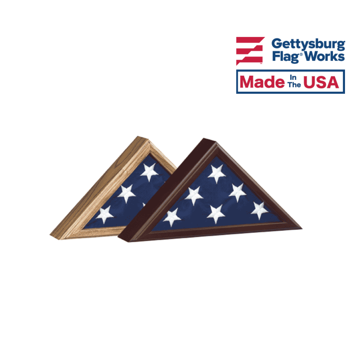 Our distinctive flag case for display of 3’x5′ flags, as flown over the US Capitol, over Military installations, etc. Made of Solid American Hardwood with our Cherry or Vintage Oak finish. Glass front, removable back panel with turn-button closures, wall mountable. Made in America
