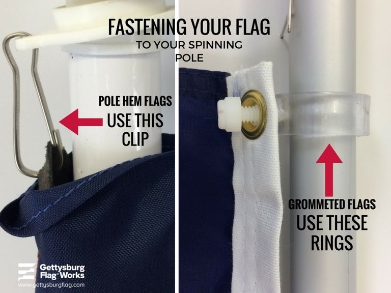 - Nut tightens thru grommet to flagpole, holding flag in place